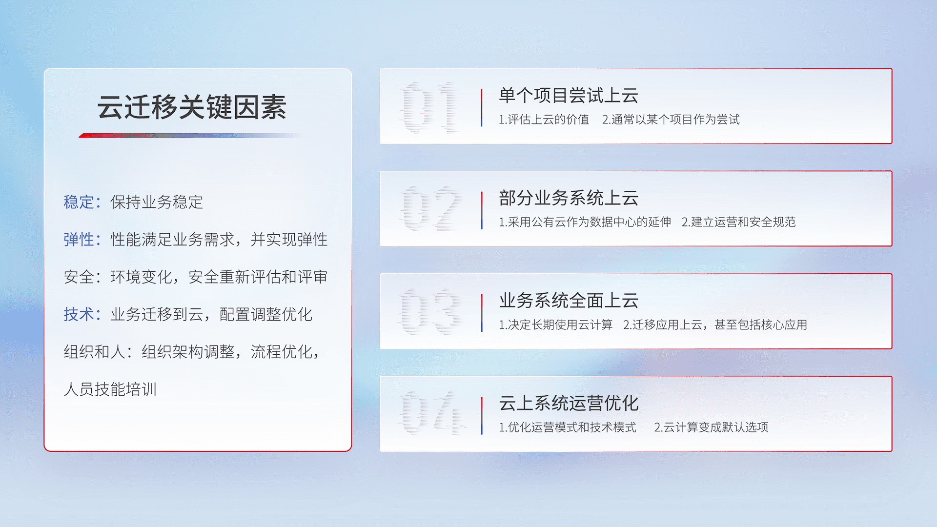 结合实际业务,,,,从规划设计、、、云平台选型、、云原生改造、、数据迁移、、、集成交付,,迁移全过程为客户识别最佳上云路径,,,做好风险识别管理,,,设计网络架构、、身份权限、、安全审计合规、、、、操作审计、、、日志审计、、监控告警策略、、多站点容灾设计等,,对云上基础设施进行整体规划,,,,提升IT治理水平,,以满足弹性、、、、高可用、、、、高性能的需求。。。