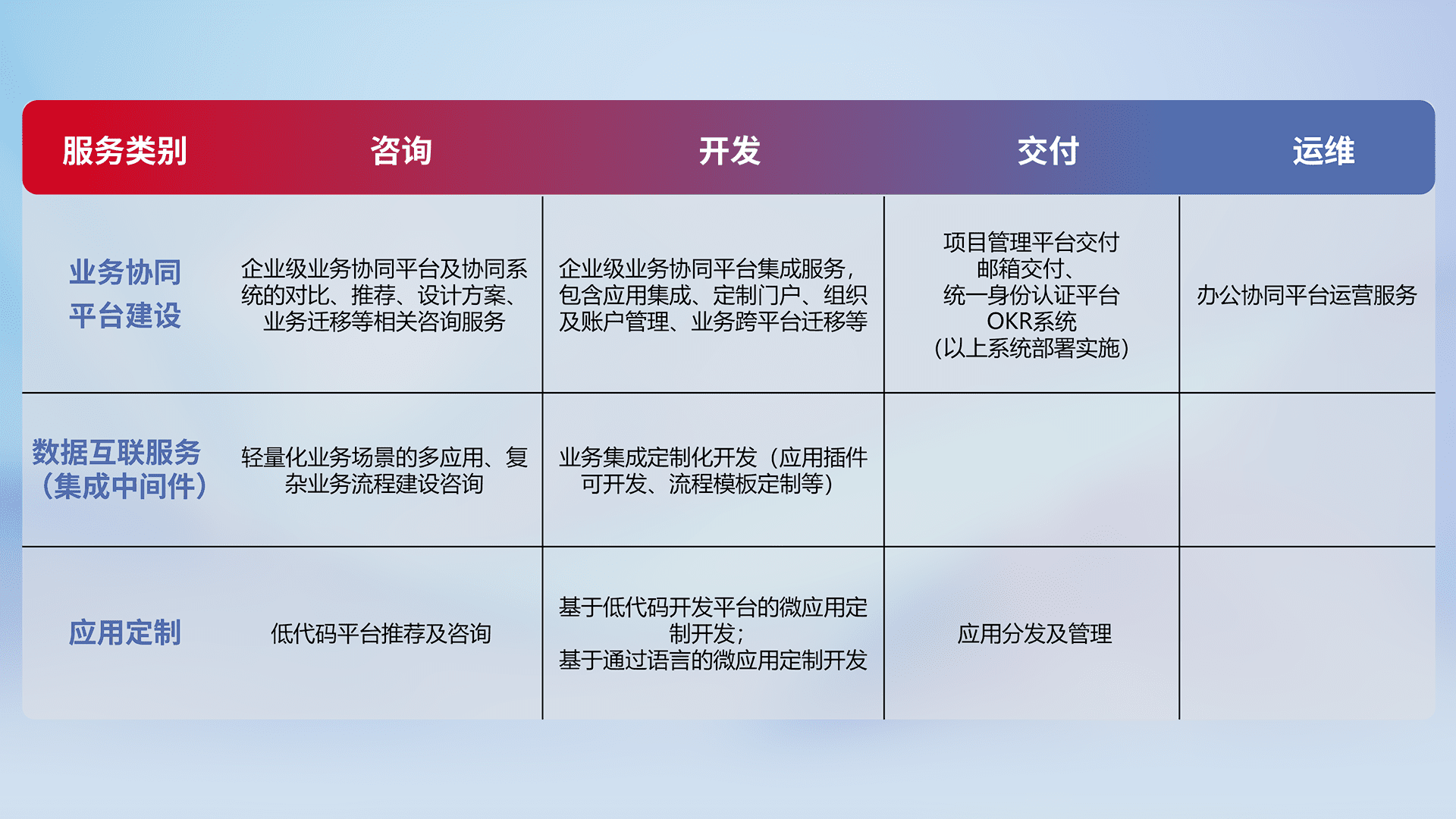 针对钉钉、、企微、、、IDaas等平台级产品提供产品的规划、、、方案、、交付、、定制化开发等服务,,实现如统一协同办公、、智能客户服务、、、混合会议管理、、、、智能数据查询、、、等业务场景,,实现数字化转型。。。